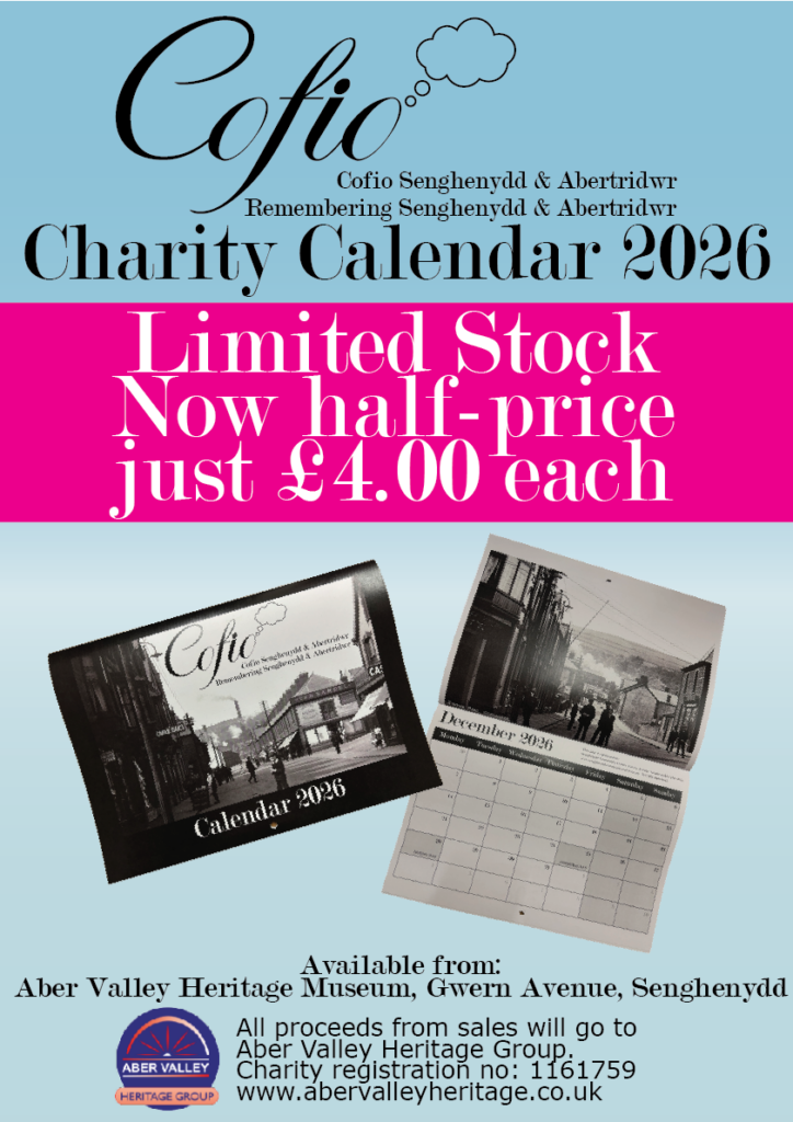 Aber Valley Heritage Group’s 2026 Charity Calendar has now been reduced to £4.00 and is available in limited quantities from Aber Valley Heritage Museum. All proceeds from sales will go to Aber Valley Heritage Group Charity registration no: 1161759.